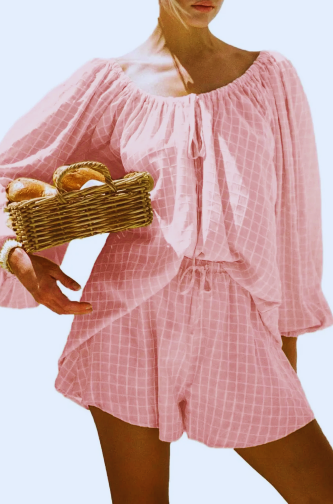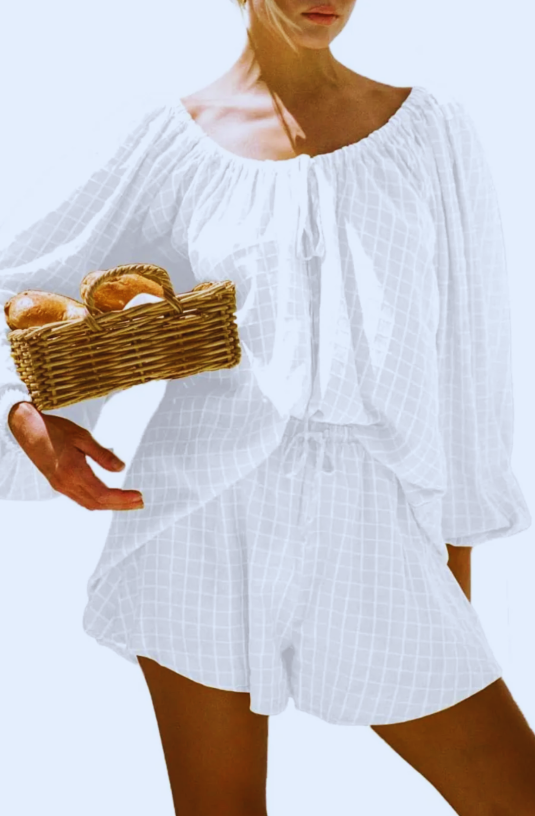 Sunshine style, wrapped in ease. The Mariz Matching Set™ is your golden-hour go-to, made for farmers markets, beachside strolls, and lazy brunches. With its soft grid print, breezy off-shoulder top, and relaxed drawstring shorts, this look is effortlessly charming and endlessly wearable.