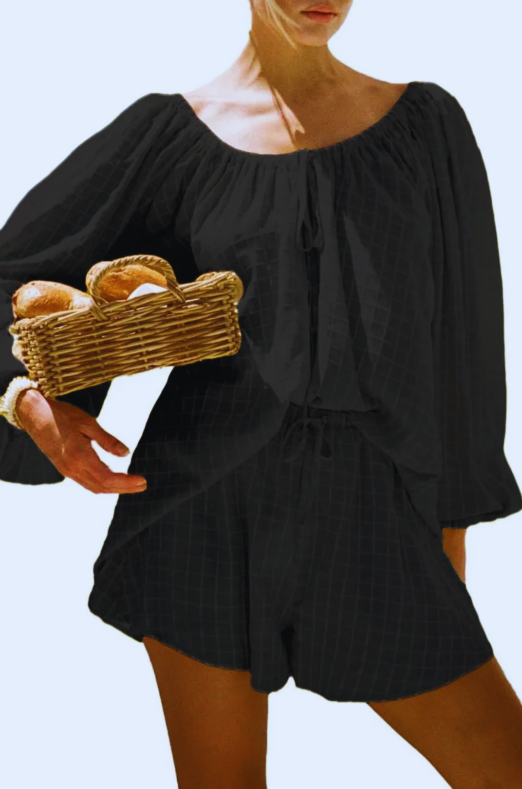 🎀 Elastic neckline with tie-front & flowy balloon sleeves