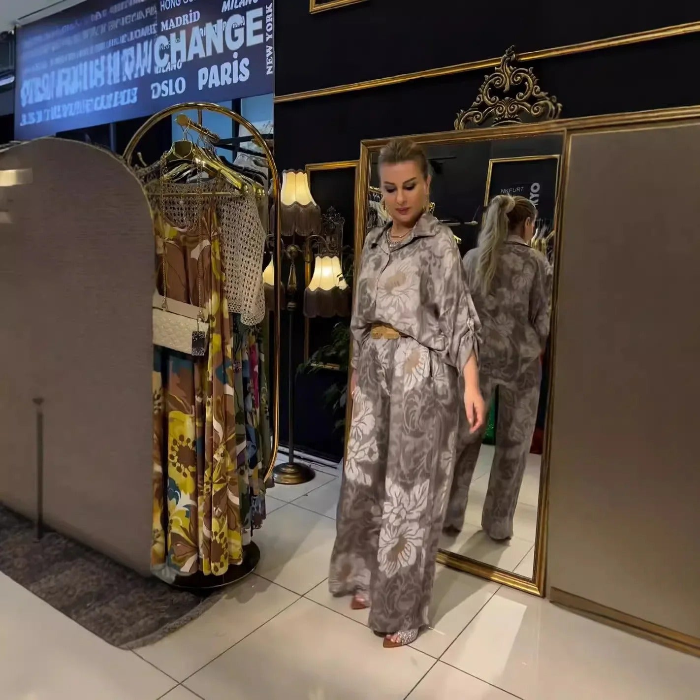 Vintage florals meet modern fluidity 🌾 The Mirah Matching Set is a statement in softness, featuring a relaxed button-up blouse and matching wide-leg trousers, both adorned in a romantic jacquard-style floral print. Designed for ease, styled for elegance.
