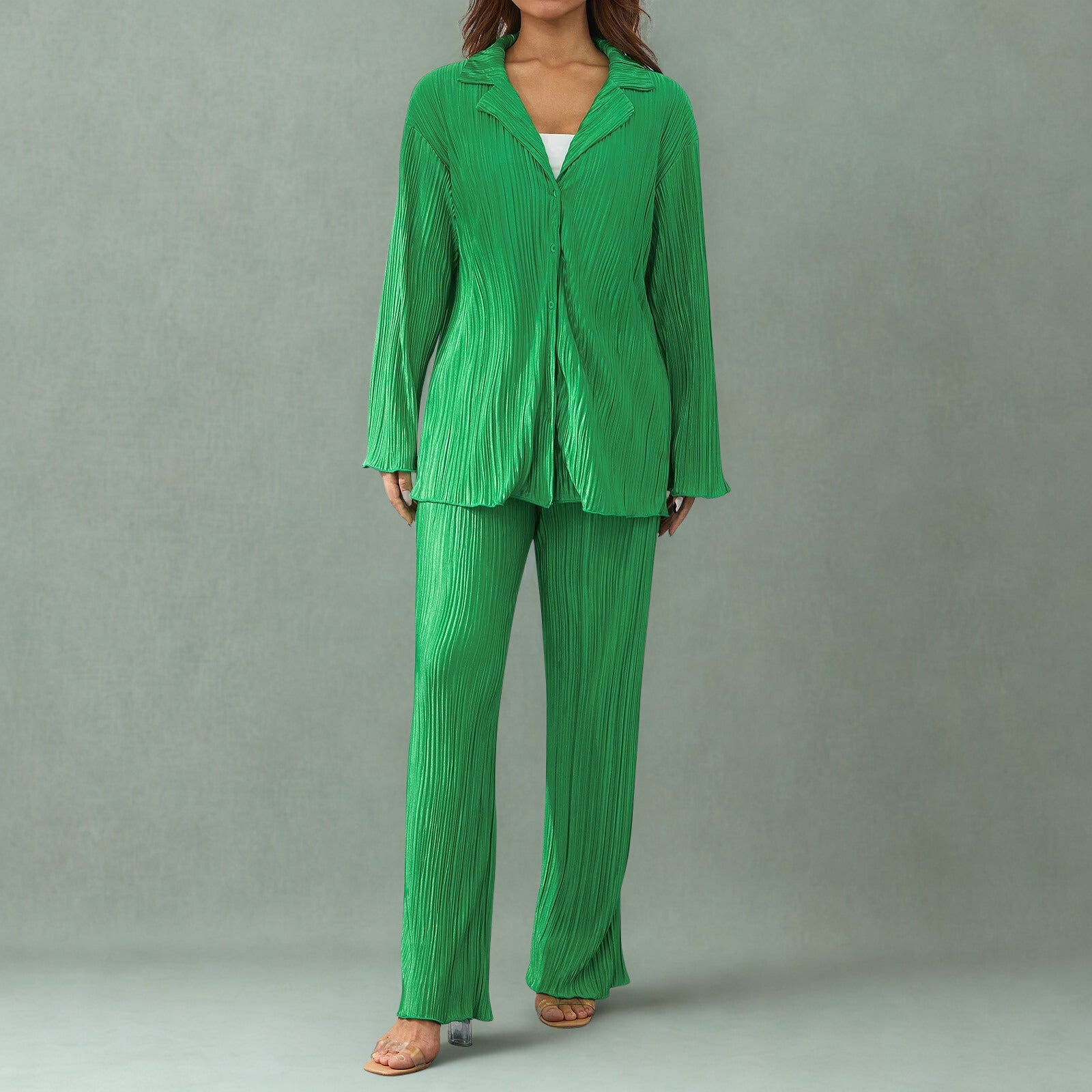Minimal effort. Maximum elegance. The Sara Pleated Set™ is your go-to for modern ease. Featuring a relaxed button-up blouse and matching high-waisted wide-leg pants, this monochrome look is made from breathable, pleated fabric that moves like liquid silk.